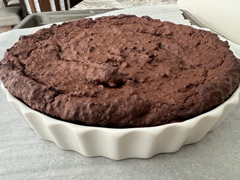 Using a food processor, reduce the dates to a soft paste. Add in the cocoa, baking powder and salt and briefly process. Add the eggs and pulse until the mixture is smooth and light (a minute or two). Pour into a greased pan. I used a 15 cm round pan. Bake at 350 F for 35 minutes, turn off heat and let sit in oven for 10 minutes so cake doesn’t fall. Remove from oven.