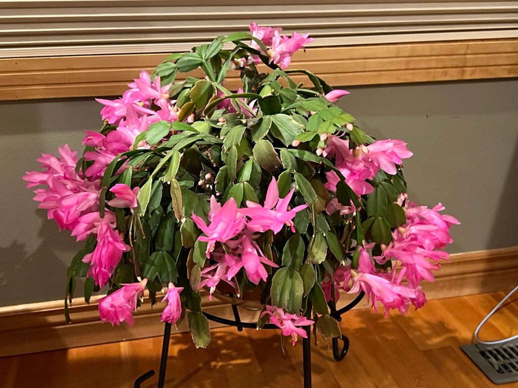 Most of the houseplants I keep have insignificant blooms, or do not bloom at all. My Christmas cactus plants are an exuberant exception! They produce such a flourish of blooms that their weight pulls the branches down.