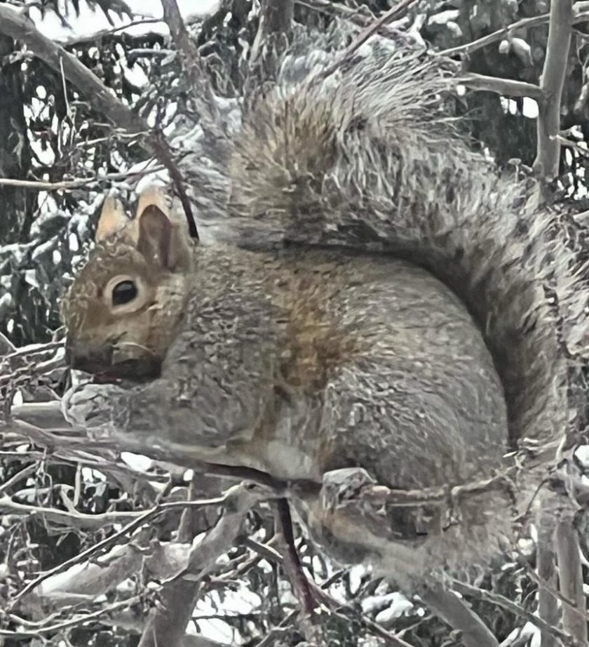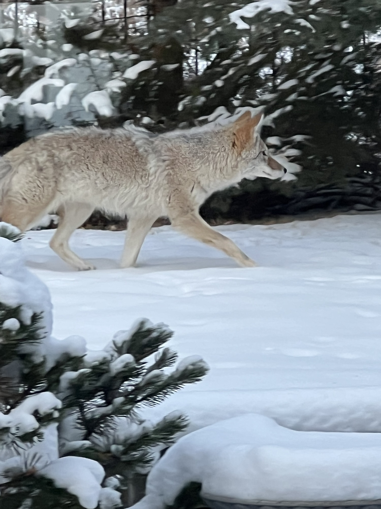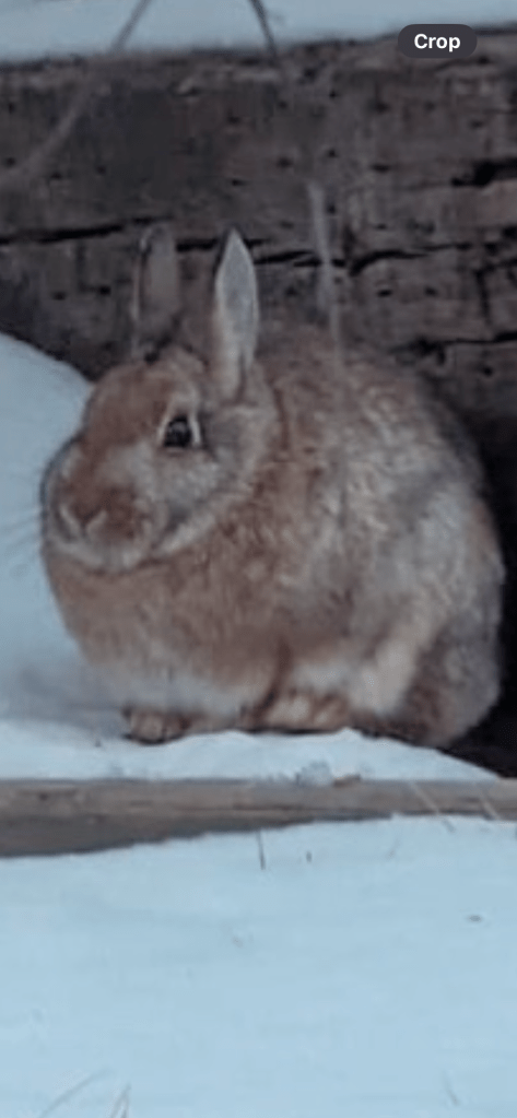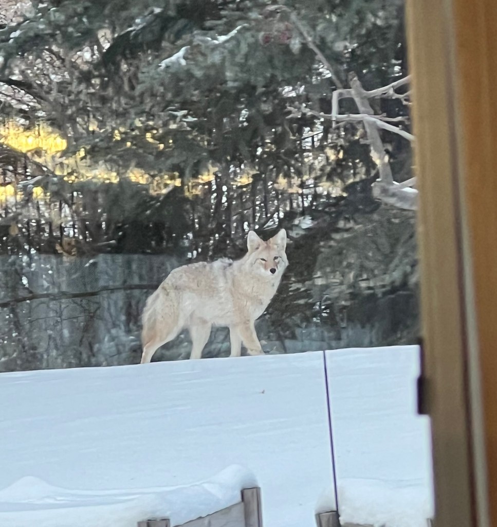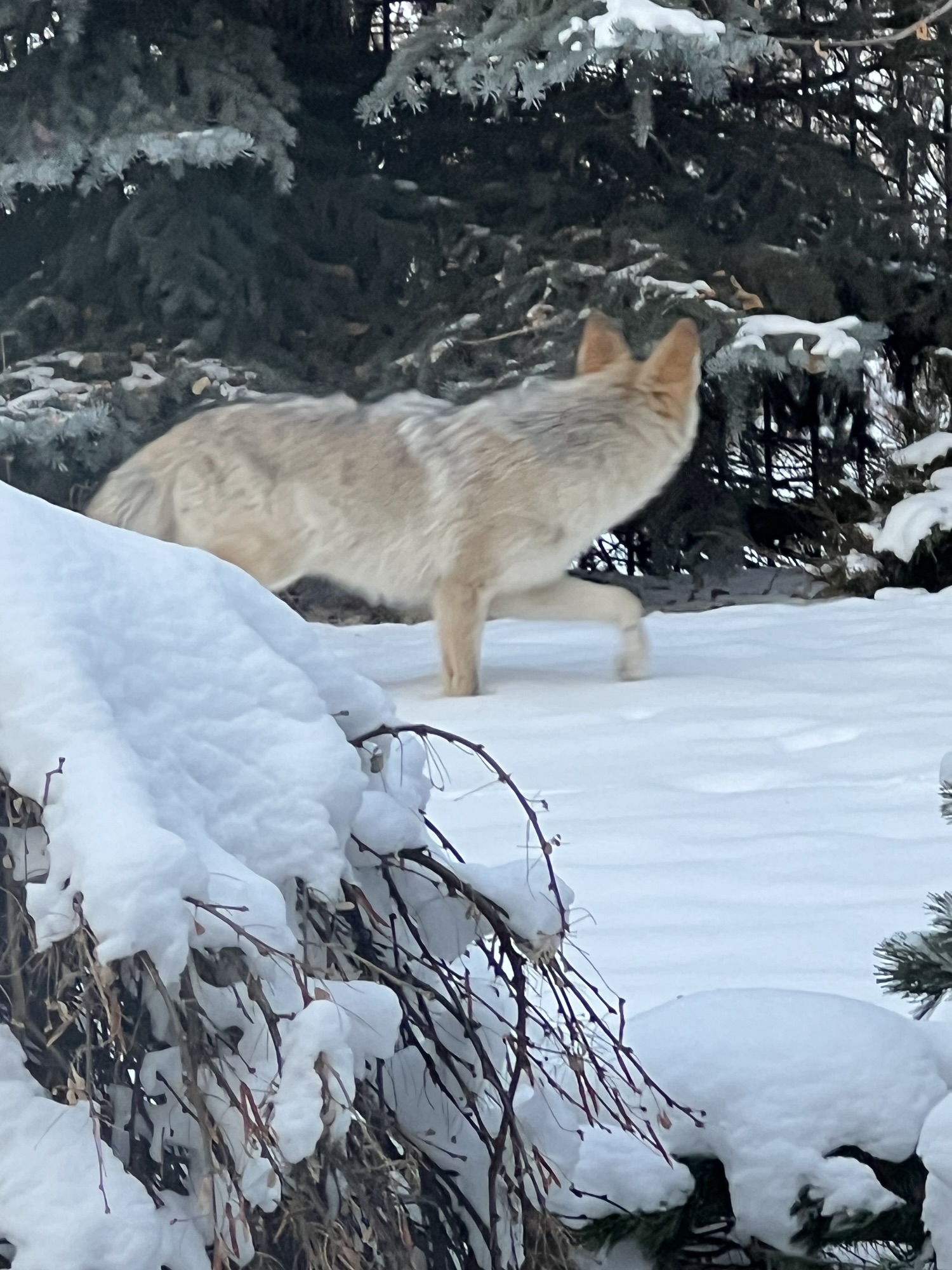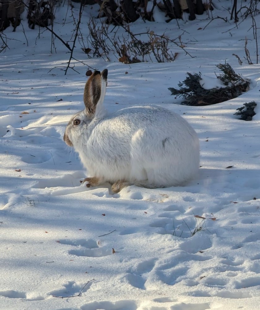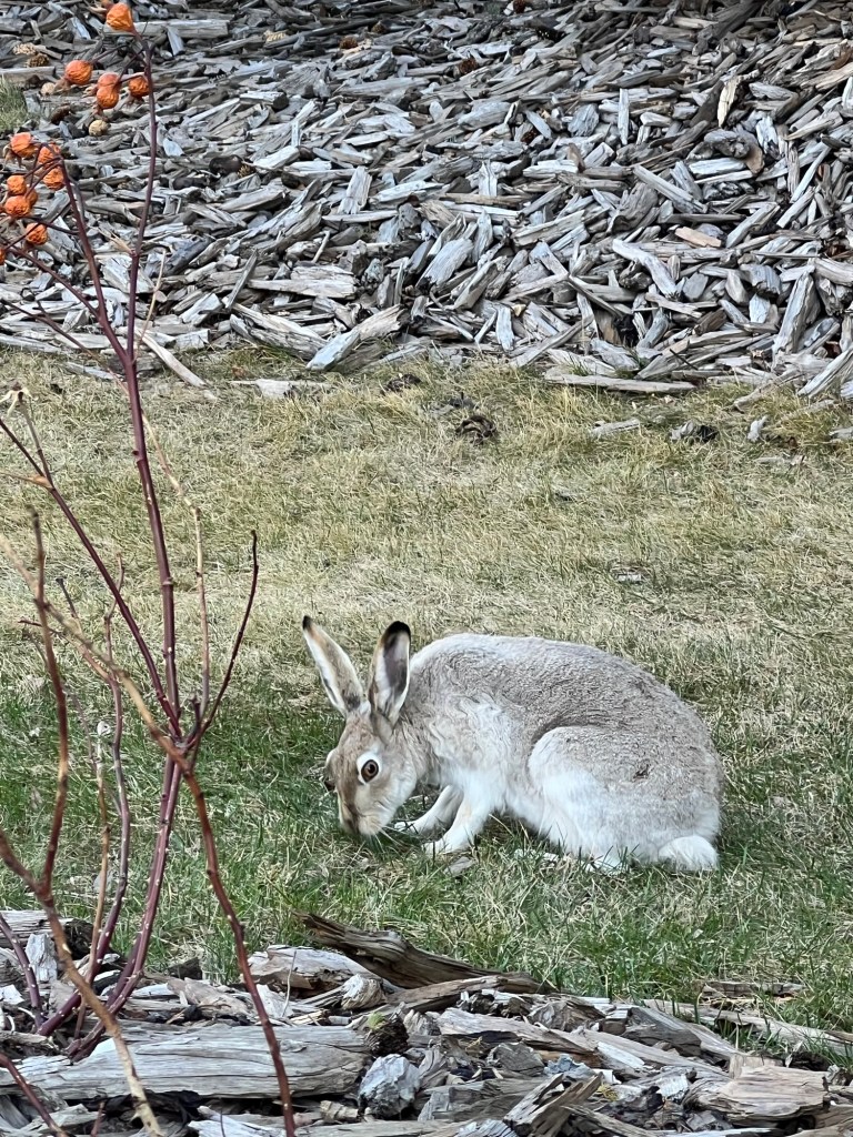 The rabbits and hares come for shelter among the shrubbery and to eat dried crabapples, the coyotes come looking for the rabbits and hares, and the squirrels live here year round presumably sustaining themselves on my potatoes, raspberries and tulips that they have eaten or hidden for later consumption! One bold individual seemed to enquire of my cat as to whether her fluffy bed was for lease…! Cat replied in the negative, but wondered about the day’s menu.