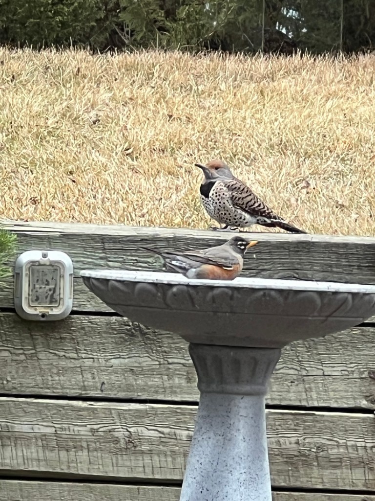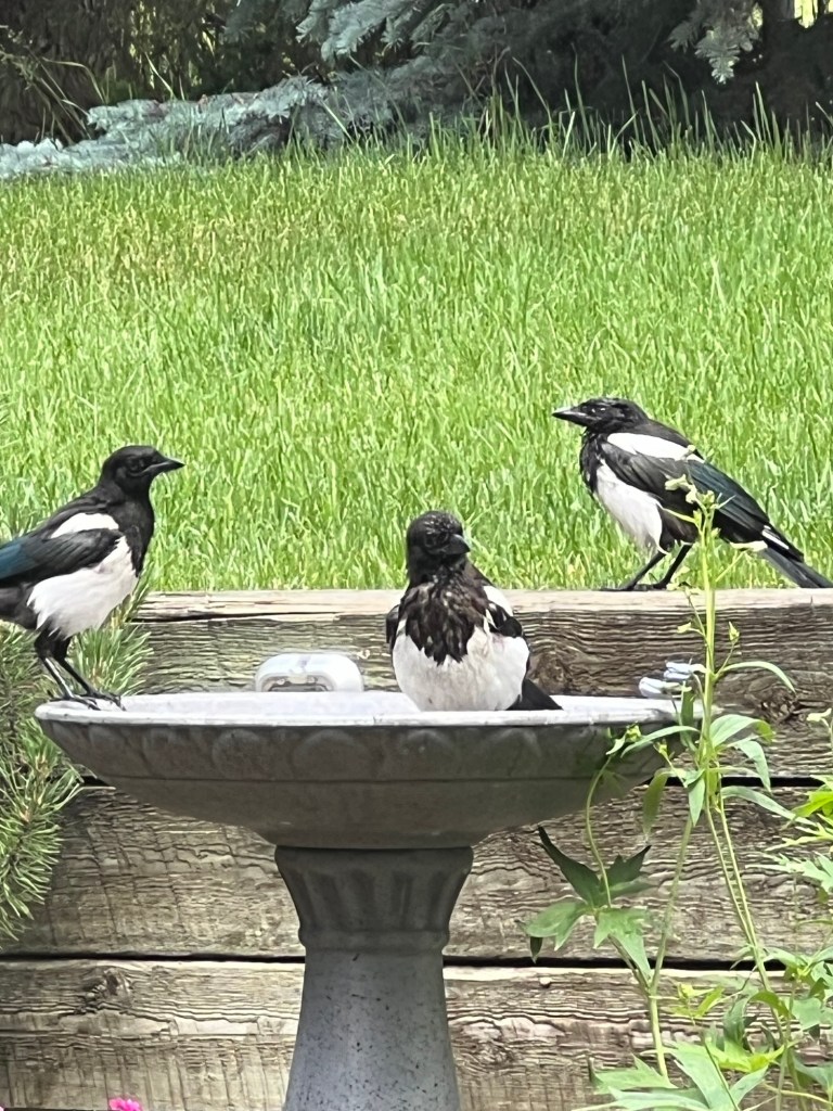 One of the things I enjoy about where we live is the variety of bird and animal life that lives in or passes through our backyard. We have seen house finches, northern flickers, red breasted nuthatches, robins, black capped chickadees, dark eyed juncos, white throated sparrows, red eyed vireos, orange crowned warblers chipping sparrows, downy woodpeckers, redpolls, common grackles, common starlings, crows, magpies, bluejays, clay coloured sparrows, house wrens, grey partridges, bohemian waxwings and even ducks with their fluffy wee entourage pass through. We have enjoyed using the birdNET app to help identify species by their vocalizations as well. Some come for the dried crabapples and berries in winter, some for the worms and insects and a few just want a bath!