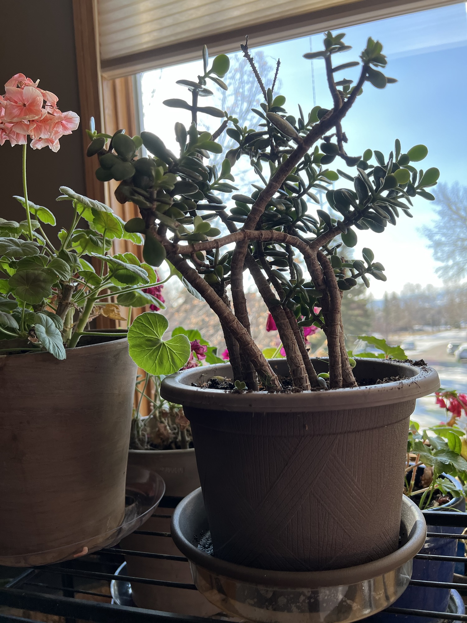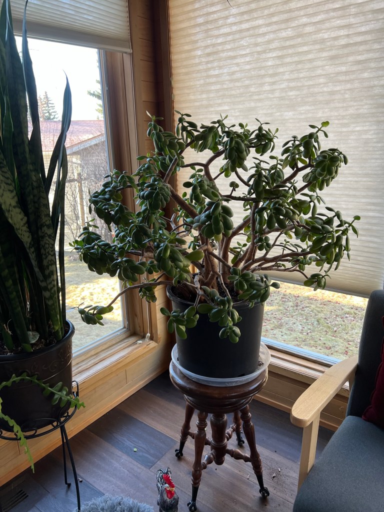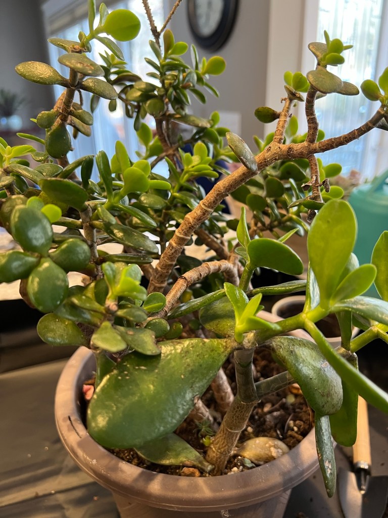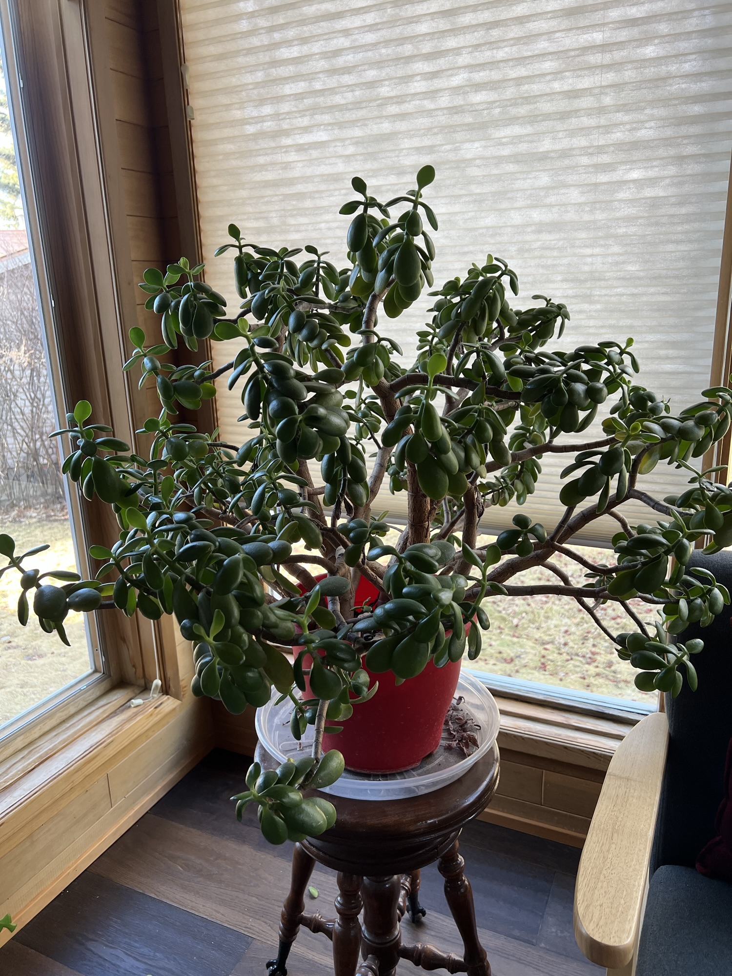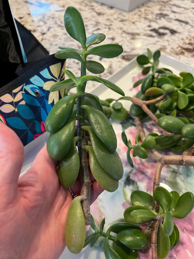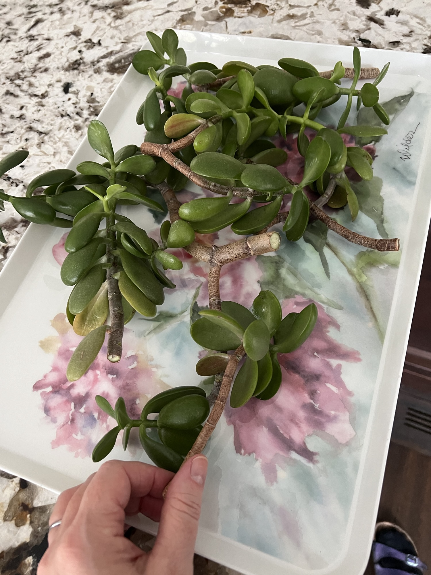 I have had this jade plant for over 20 years. It has been reduced to half its size in a moving mishap, and made lopsided after breakage by a kitten pounce (not the cat in the photo). I pruned a few of the less sturdy stems off so the plant will bush out and I can use the stems to start a new plant.