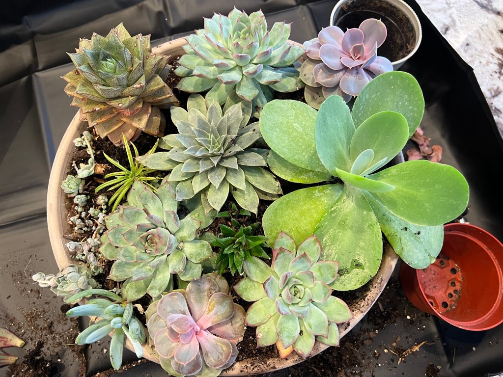 I have had the succulents in this bowl going for three or four years now. I put the bowl outdoors in summer and bring it in when the temperatures drop. Most years I need to add another plant or two either because I have switched to a larger bowl, or as is the case this year, I lost a plant to disease. I used a solo succulent I had in the sunroom and bought a new addition as well. I rearranged a few of the existing plants to accommodate larger spaces for the new ones and added some fresh soil. I think it looks much better.