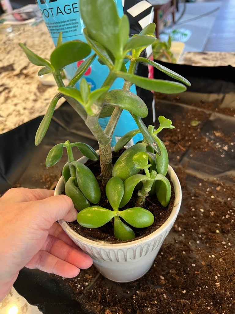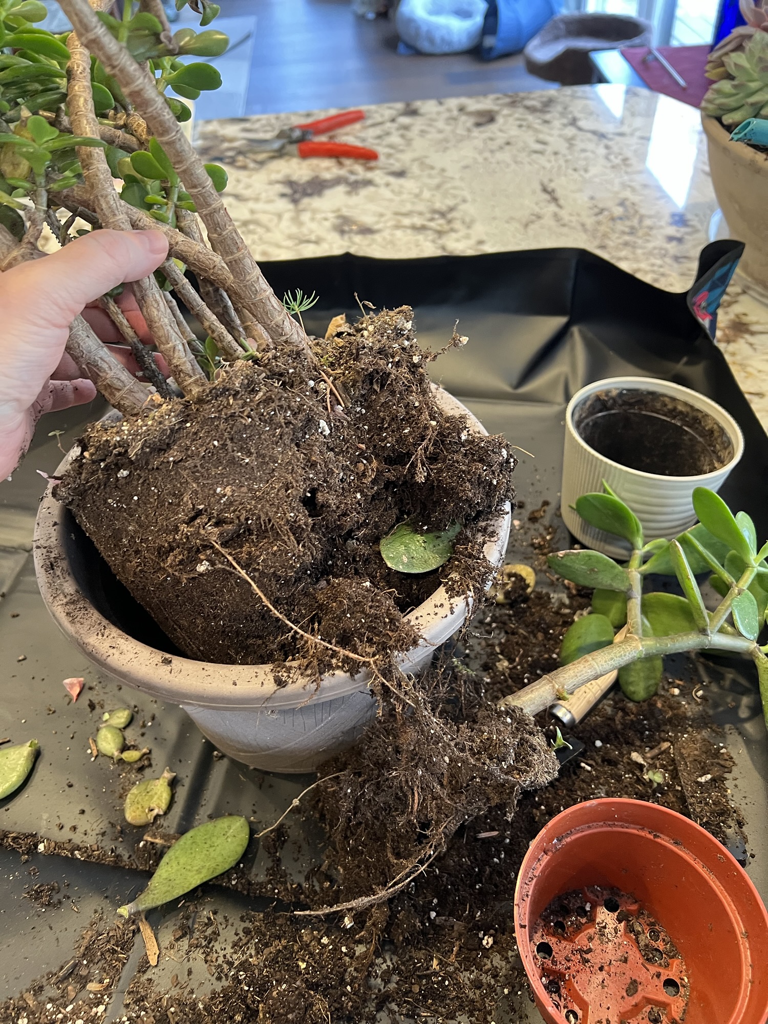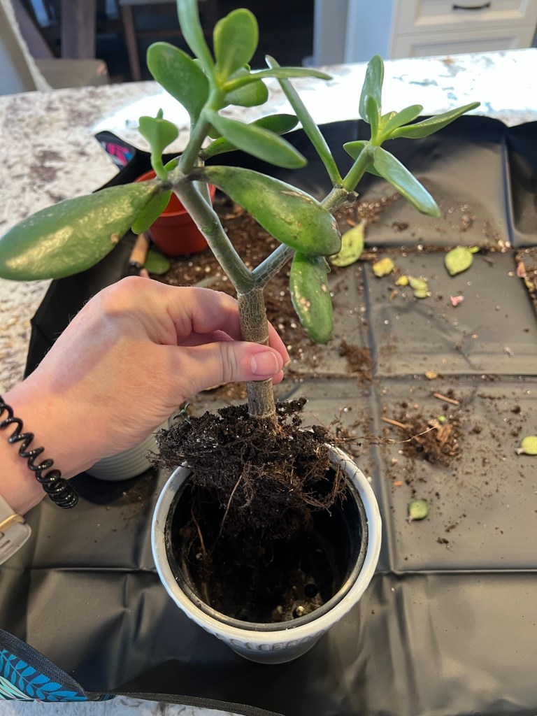 The dwarf jade was getting crowded out by the standard cutting. The cutting had rooted well but was easy to remove from the side as the roots were not entwined. I repotted the dwarf jade plant, adding a bit of soil.