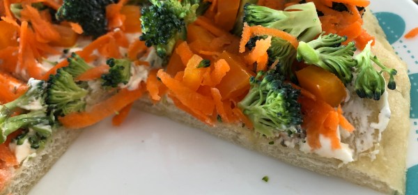 This is a simple thing to make for a lunch or cut smaller for appetizers. Garlic naan, or pizza shell Herb cream cheese Red pepper