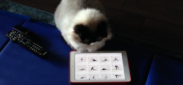 It is impossible to stretch or do floor exercise in this house without getting help from the cats. They walk under our bellies, sit on