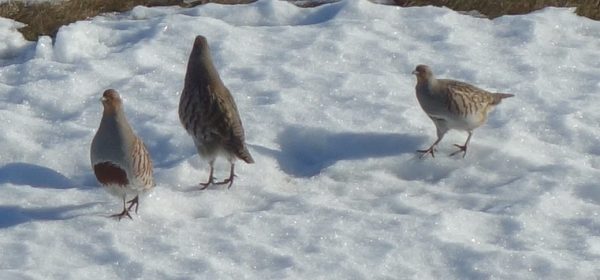 We had some cute little visitors this weekend: a small flock of Hungarian Partridges! They bustle along at quite a clip, (like birds in a